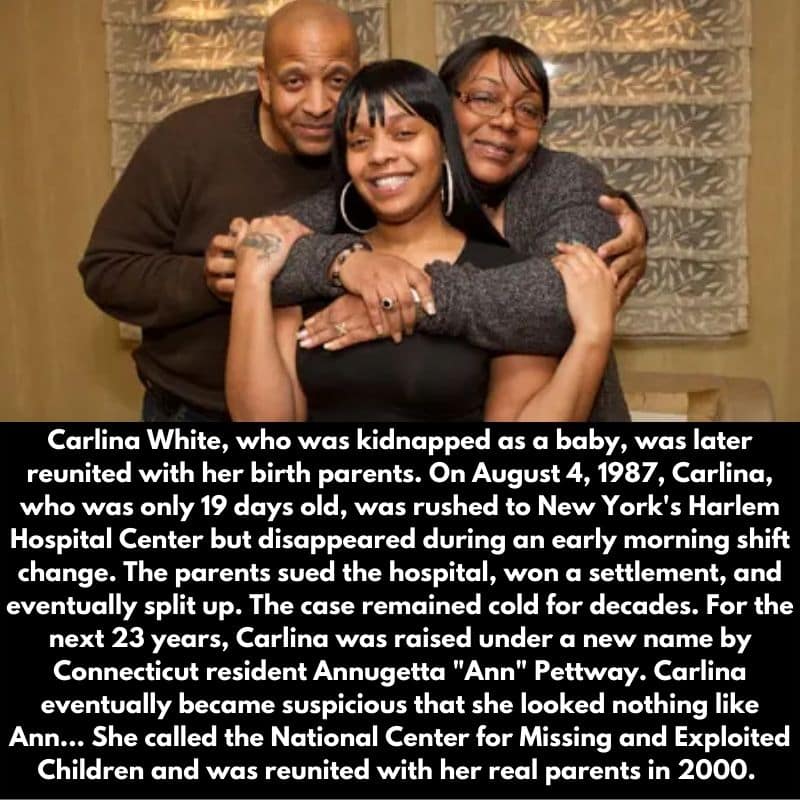 In 1987, Carlina was rushed to hospital in Harlem at 19 days old due to an infection and fever, and that was the last time she saw her parents for 23 years… She was kidnapped during a shift change, but the hospital had no video evidence of the occurrence. It took 23 years for Carlina to realize that the person she thought to be her biological mother was, in fact, her kidnapper…