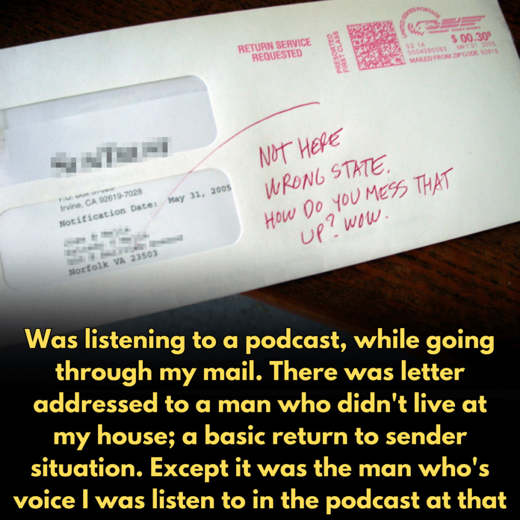 Okay, woah, this is one that is inexplicable enough to push me into full conspiracy theory mode. How is this even possible? What podcast are they listening to, and who is the speaker? How did they get the mail of the person whose podcast they were listening to, and why were they going through it exactly at that moment?