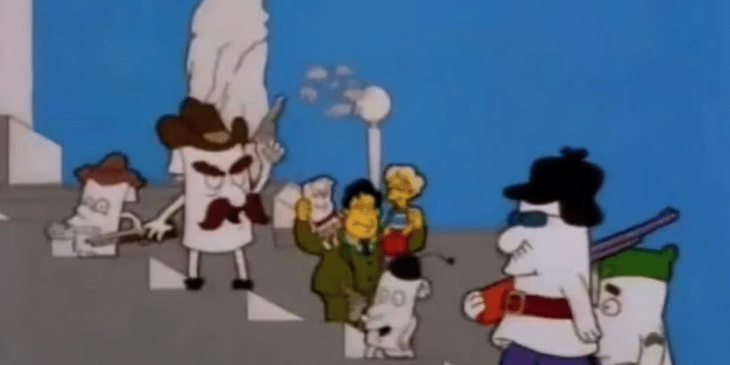 While this specific episode focused on cartoon violence and the origins of Itchy & Scratchy, it also included surreal scenes of government institutions collapsing into chaos. Over the years, The Simpsons revisited similar imagery—protesters storming buildings, flags waving amid unrest, police overwhelmed.